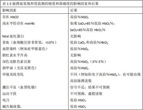 無(wú)創(chuàng)脈搏血氧飽和度的測(cè)量機(jī)制決定其存在一定局限性,復(fù)雜的臨床情況可能會(huì)影響測(cè)量精度或準(zhǔn)確度。表1-3總結(jié)了一些Z重要的因素以及它們可能導(dǎo)致的測(cè)量誤差。